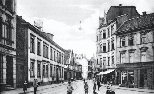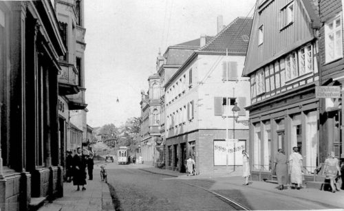 Wer heute vor den Schaufenstern des alteingesessenen Herrenbekleidungsgeschäftes Uhlenkott steht, kann sich nur noch schwer vorstellen, wie es hier früher aussah, an der Ecke Haupt- und Drosselstraße.