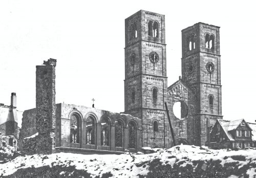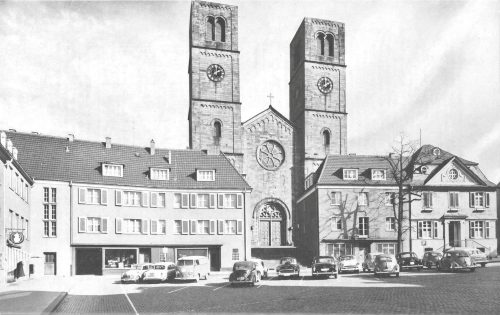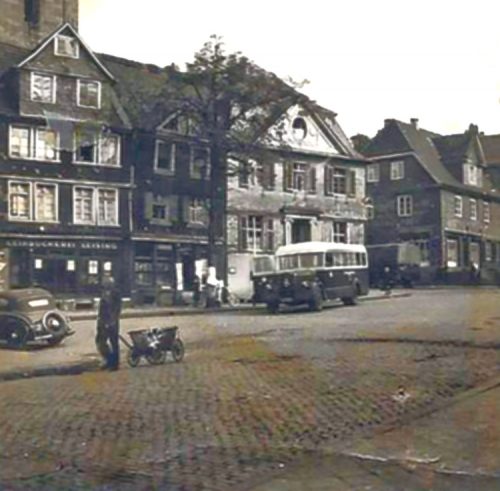 „Dieses Bild wird noch vielen älteren Schwelmern lieb und vertraut sein. Es ist die Ostseite des Altmarkts mit den alten bergischen Schieferhäusern, hinter denen sich die zum Himmel ragenden Türme der Christus- kirche recken. Nur eine ganz schmale Treppe führte damals zum großen Portal der Kirche. Links im Bild das Wohnhaus der Schnapsbrennerei Gogarten. Die Brennerei befand sich gleich nebenan mit einem kleinen Ausschank, in dem man ‘einen Dicken’ für ’nen Groschen bekam.