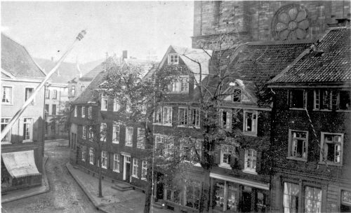 Die Häuser an der Ostseite des Altmarktes stammten noch aus der Zeit vor 1722, das Feuer hat sie damals verschont. Das Eckhaus Altmarkt/Kirchstraße (rechts) war bis 1790 im Besitz der Familie Bröcking. Mehrere Generationen der Familie gingen hier dem Bierbrauer- und Fusselbrennergewerbe nach. Im zweiten Haus von rechts wurde einer der bedeutendsten Pfarrer Schwelms aus der Zeit des Dreißigjährigen Krieges geboren: Johannes Rump. Das Haus war bis 1803 im Besitz der Familie Kollenbusch. 1862 wurde der Händler Franz Drüke Besitzer.