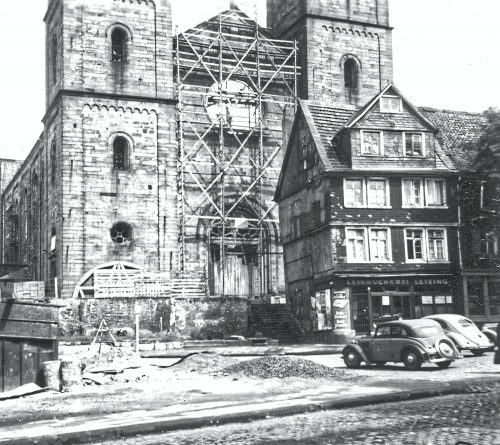 Kürschner und Kappenmacher Heinrich Drebes, ein regsamer Handwerker und Geschäftsmann, hatte sein Haus und seinen Laden gleich neben der Kirchentreppe. Ein schmales Haus mit einem Winkelswarengeschäft und einer Gemüsehandlung von ‘Drüken Eia’ schloß sich an. Wo einst eine schmale Treppe zur Christuskirche hinauführte, wurde 1955 eine breite Treppe und links und rechts moderne Wohnbauten erstellt.“ [21]