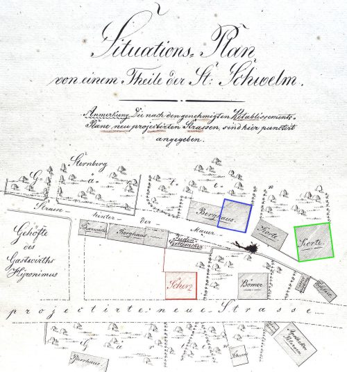 Nach dem zweiten Stadtbrand von 1827 gründete Johannes Klein 1830 seine Brauerei auf einem Grundstück vor der Stadmauer. Hier gab es genügend Platz für zukünftige Erweiterung. Auch war die Brandgefahr wesentlich geringer als in der engen Stadt. Zu dieser Zeit wurde obergäriges Bier gebraut. Das blau umrandete Gebäüde ist noch heute erhalten. Hier stehen die Kupferkessel. Im grün umrandeten Gebäude war später die Verwaltung der Brauerei. Heute steht dort eine Nachbildung.