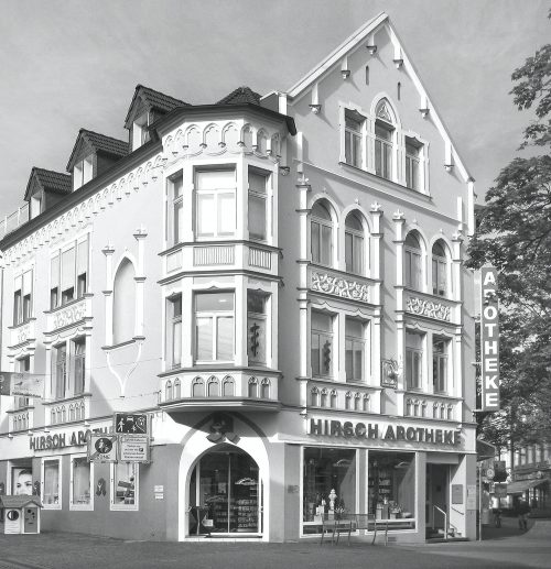 Um 1897 steht noch das Fachwerkhaus von 1767 mit einem Rokokogiebel an der Kirchstraße. Dort liegt auch der Eingang zur Apotheke. Das Haus nebenan, Kirchstraße 4, stand noch bis 1960, bevor es durch einen „schmucken Neubau“ ersetzt wurde. Vor der Apotheke, auf dem heutgen Bürgerplatz, steht eine Meteorologische Säulenuhr, die der Stadtrat 1888 in öffentlicher Sitzung genehmigte. Die Straßenbahnschienen sind auch von 1897.