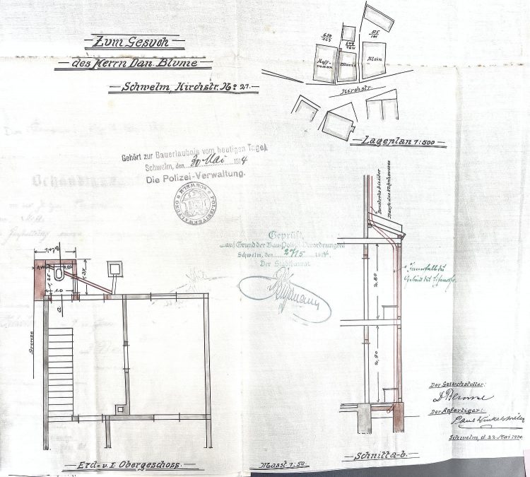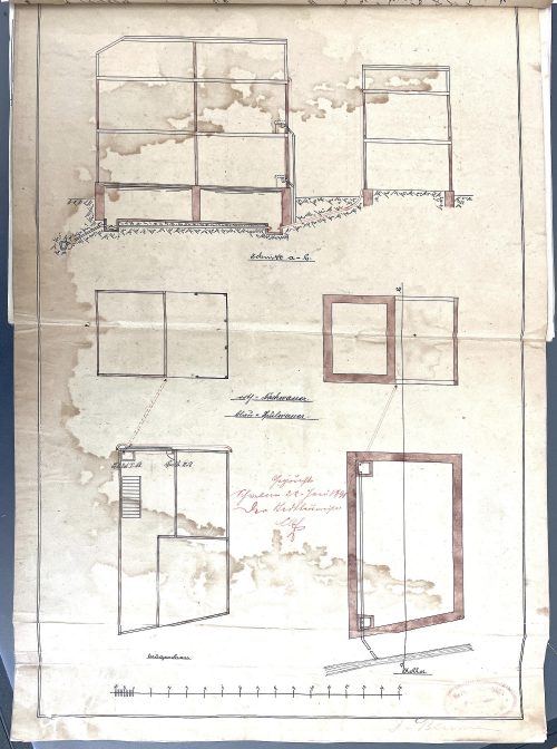 Ein Bauantrag für den Anschluss an den Abwasserkanal. Es sind nur zwei Spülsteine eingezeichnet. Auf diesem Plan vom 22 Juni 1891 sind noch die Grundrisse des alten Stalls im Hinterhof eingezeichnet. Die linke Hälfte steht auf dem Nachbargrundstück. Auf Zeichnungen von 1909 ist die linke Hälfte verschwunden.