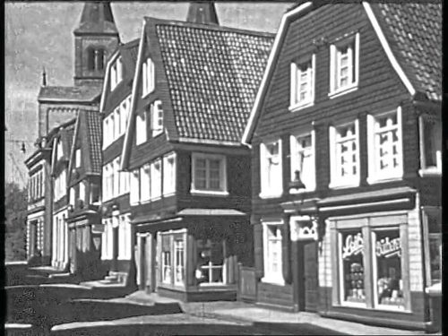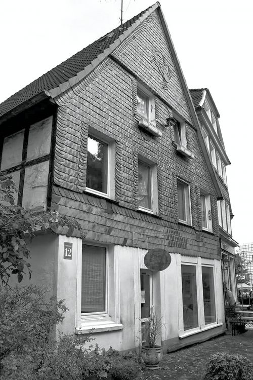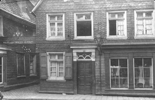 Nach 1945 ist das Türportal und das Gesims über den Schaufenstern verschwunden. Zierleisten und Fenstersprossen muss man zeitaufwendig säubern. Schnell und bequem musste jetzt alles sein. Kurz vor dem Abriss sind dann auch keine Sprossenfenster mehr vorhanden. Die weißen Fensterfutter wurden entfernt und verschiefert. Auch der Walm ist weg und der Giebel schön gerade. Das Schieferbild des Westfälischen Wappenpferds kann es auch nicht mehr retten.