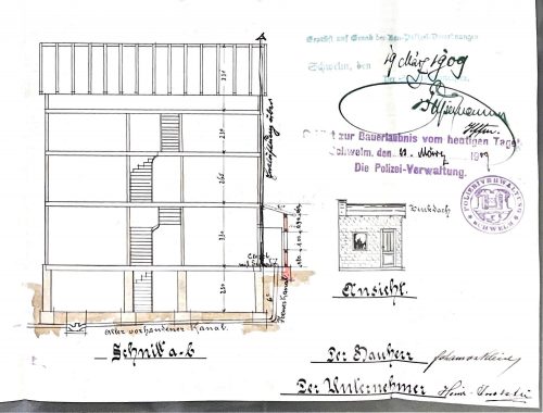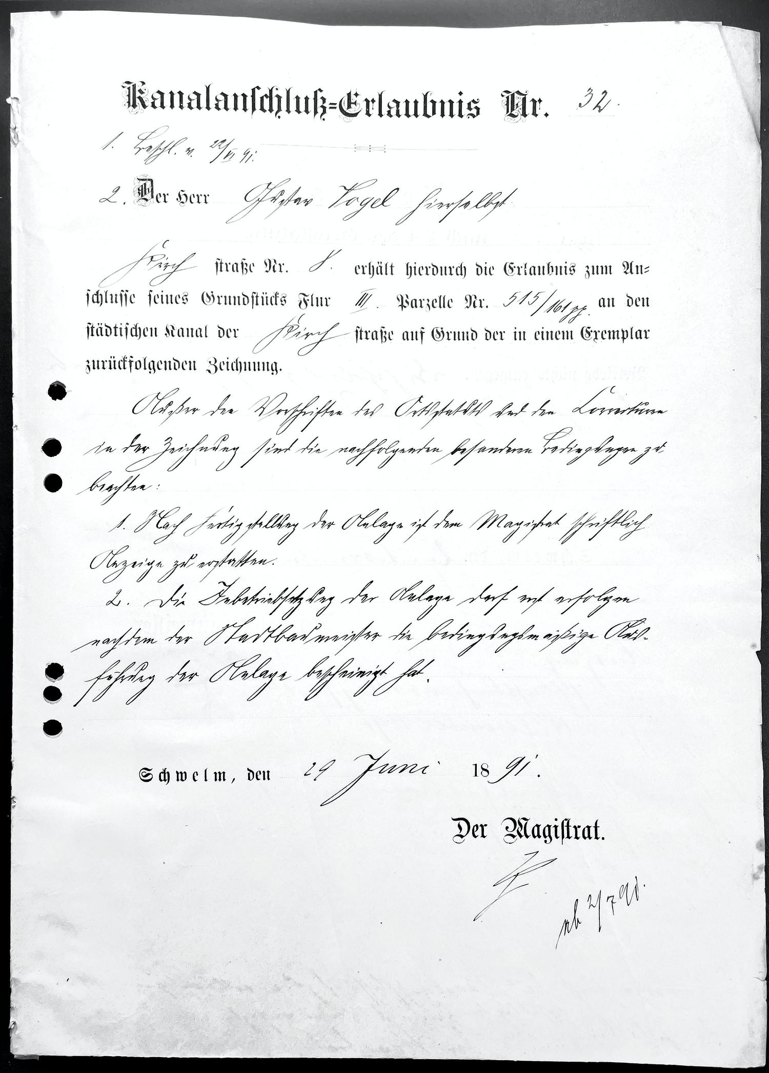 1891 | 8 | Gustav Vogel erhält die Erlaubnis sein Haus an den städtischen Kanal anzuschließen |