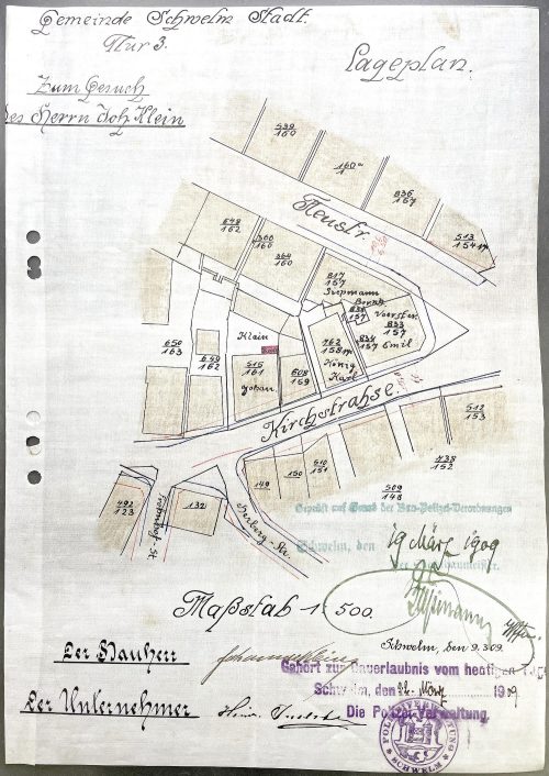 Im Adressbuch von 1873 kann mit Gustav Vogel erstmals ein Eigentümer der Kirchstraße 8 nachgewiesen werden. Er betreibt eine „Specereiwaren- und Delicatessen-Handlung“. Irgendwann zwischen 1891 und 1897 übernimmt dann Johannes Klein das Haus und das Geschäft. Bereits 1891 erhält G.Vogel die Erlaubnis, sein Haus an die öffentliche Kanalisation anzuschließen. Doch erst J. Klein baut ein „Closet“ wie damals übliche auf dem Hof.