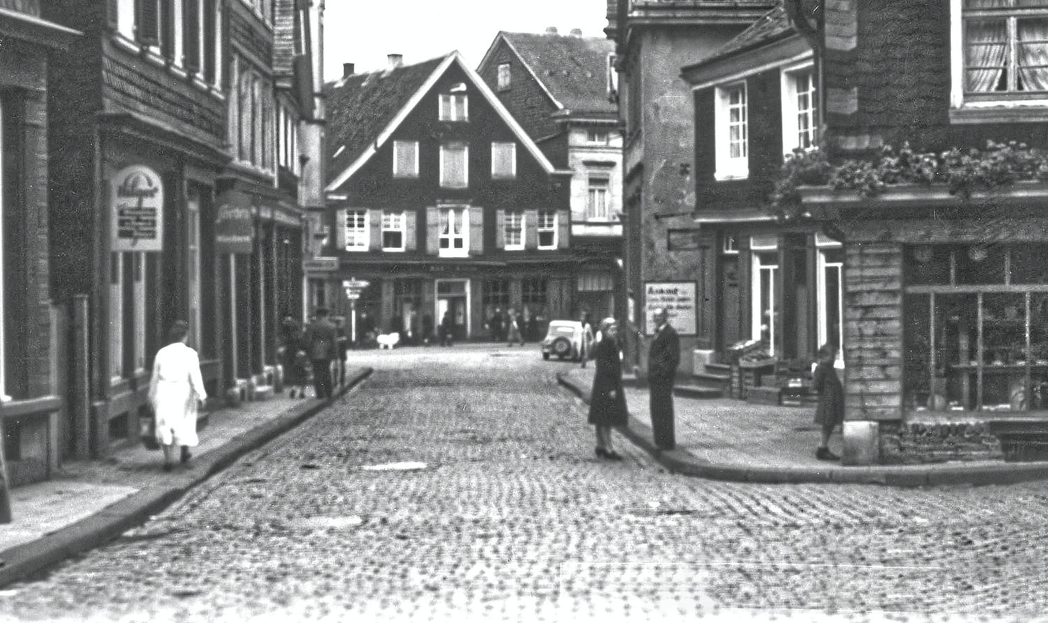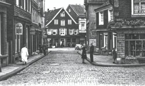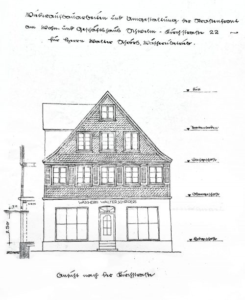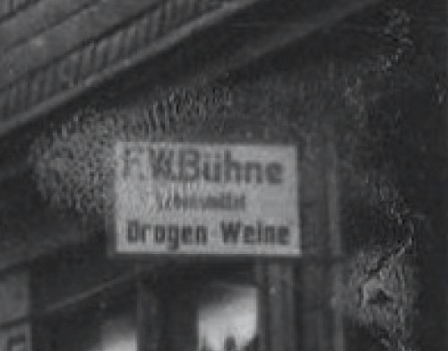 Bevor Walter Schroers nach dem Weltkrieg die Wäscherei gründete, die bis 2021 ansässig war, wurde durch F.W: Bühne noch „Drogen & Weine“ im Geschäft verkauft. Davon gibt es bisher nur ein Bild vom Ladenschild.