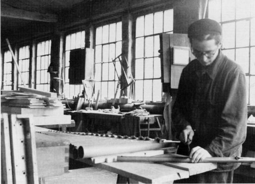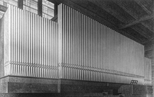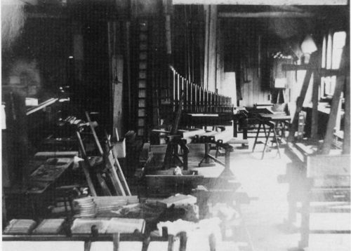 Die Räumlichkeiten des Orgelbauhandwerklichen Betriebes sind gut durchdacht… Im Erdgeschoss befindet sich der Maschinenpark mit Schmelzofen für die Metallpfeifen, oben hinter den großen Fensterfronten stehen die Werkbänke. Zahlreiche Bauelemente lassen sich auf- und wegklappen, so dass die riesigen Orgelteile überhaupt verladen werden konnten.