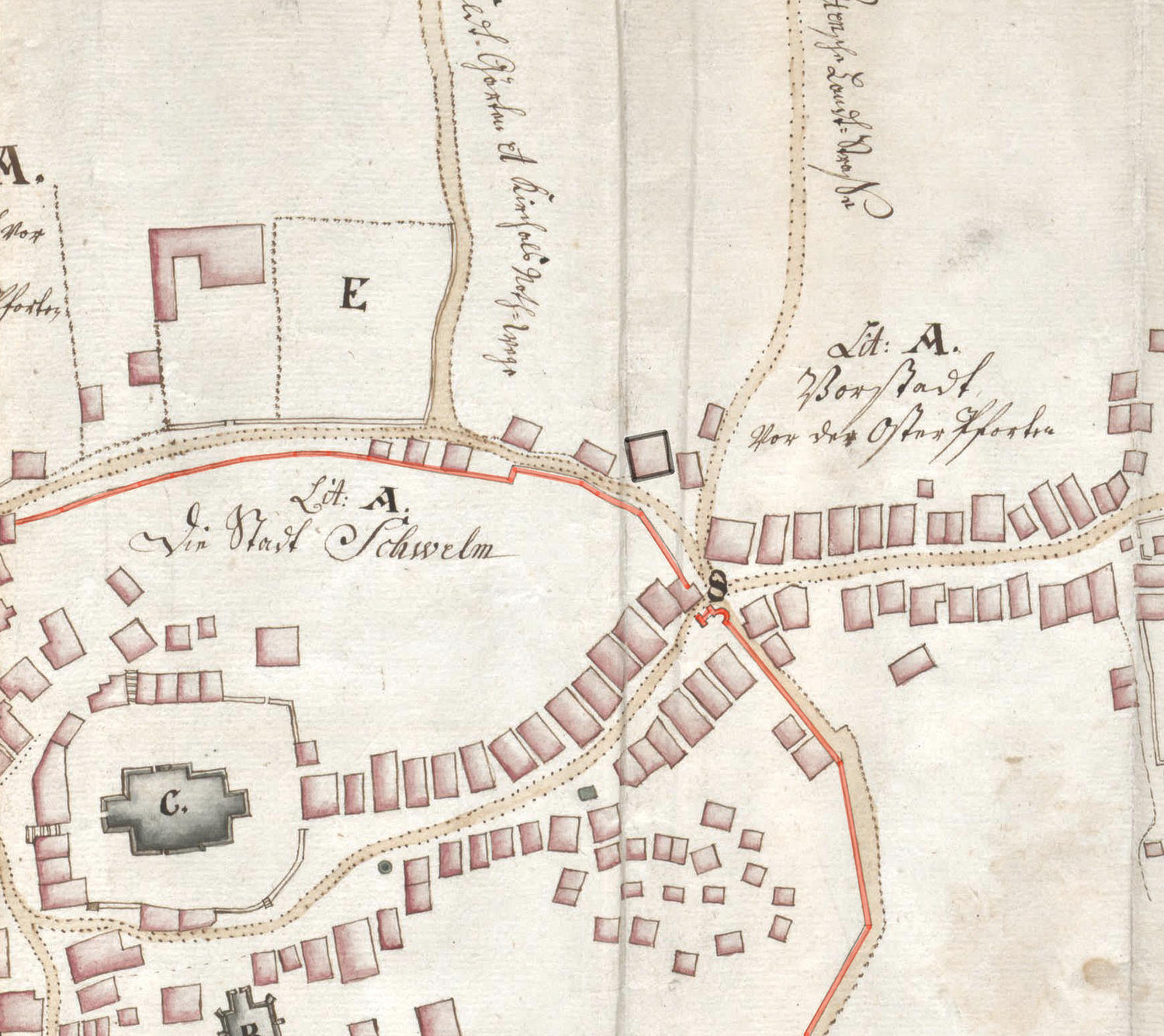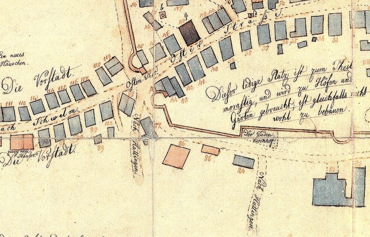 Bereits in der Steuerliste von 1701 ist das sogenannte Patrizierhaus aufgeführt. Es lag ausserhalb der Stadtmauer und musste daher nicht auf die enge Nachbarbebauung rücksicht nehmen. Auf dem Stadtplan von 1722 ist es als Nr. 86 in rot eingezeichnet (Norden ist unten!). Die rote Markierung zeigte an, dass es ein teures Dach ohne Roggenstroheindeckung hatte.