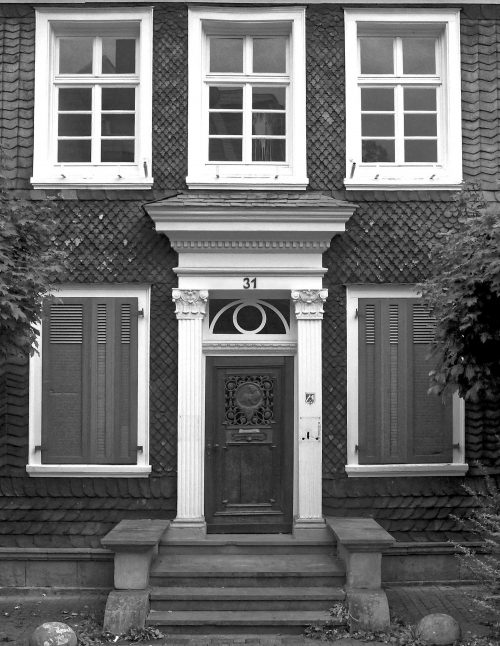 Links (bzw. oben) der Originaleingang des Hauses vor dem Abriss. Rechts (bzw. unten) das Portal am Neubau von 2023. Die Verdachung des Portals reicht bis zur Unterkante des Fensters im Obergeschoss. Der Architrav liegt auf der Oberkannte der Fenster im Erdgeschoss. Auch das Oberlicht der Tür und die Oberlichter der Fenster (n. sichtbar) bilden eine Linie. Die Fenster sind zweigeteilt und gliedern die sonst große schwarze Fläche der Gläser. Das neue Portal ist breiter und behindertengerecht.