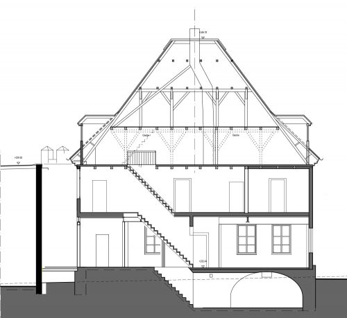 Der Architekt Klaus Lange hat das Haus gründlich untersucht und dokumentiert. Auf diesem Schnitt kann man gut sehen, welche Anstrengungen man unternommen hat, um den Kamin in der Mitte des Zeltdaches durch die Dachhaut zu führen. Form und Größe der Fenster, die Proportionen des Hauses oder die Lage des Kamins waren damals noch wichtige architektonische Details die von vielen Menschen noch erkannt wurde.