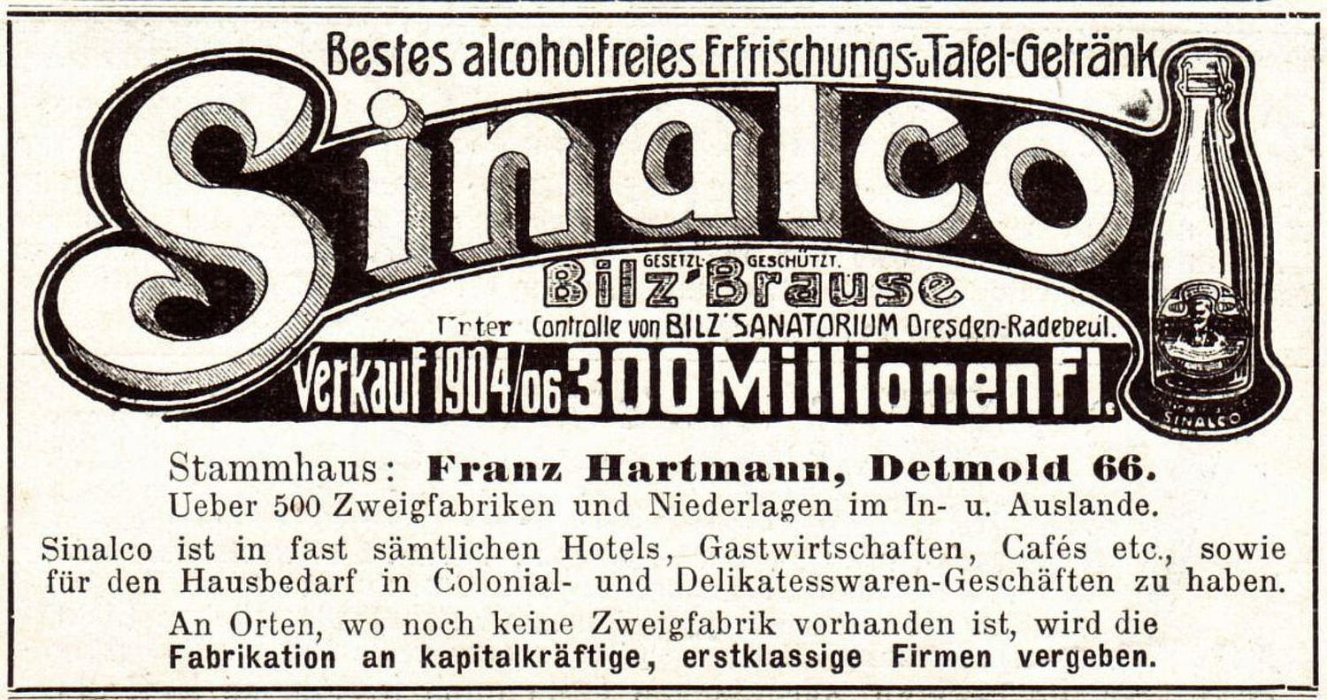Der Unternehmer Franz Hartmann besuchte 1900 Friedrich Eduard Bilz. Sie entwickelten zusammen die „Bilz-Limetta“, die ab Mai 1902 als „Bilz-Brause“ im Handel war. Die Brause hat schnell großen Erfolg. Weil Hartmann und Bilz sich um 1905 nicht mehr einig waren, sucht Franz Hartmann mit einem Wettbewerb einen neuen Namen für die Limo. Hieraus stammt der Name Sinalco (lat. sine alcohole – ohne Alkohol).