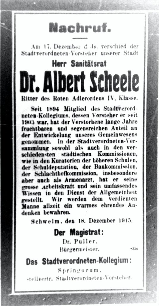 Sein Haus verkauft Berninghaus an den Arzt Dr. Albert Scheele. Er war der erste Leiter des neugebauten Schwelmer Marienhospitals und Badearzt am Brunnen. Er etabliert sich schnell in Schwelm, wird Mitglied im Stadtrat ist seit 1903 Vorsitzender des Stadtverordneten-Kollegiums. Nach Albert Scheeles frühen Tod 1915 zieht seine Frau Antonie Scheele, geb. Engels mit dem jüngsten Sohn Willy in die Bahnhofstraße.