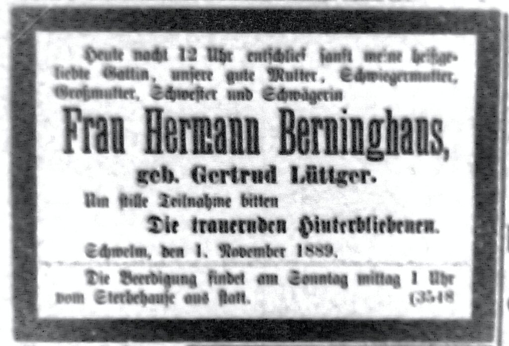 1891 | Schulstr. 29 | Kaufmann H(ermann?). Berninghaus wird als Eigentümer der Schulstr. 29. auf den Plänen für die Entwässerungsanlage genannt. Anzeige Verkauf des Hauses in der Gaststätte Burk nebenan (27) im gleichen Jahr. |