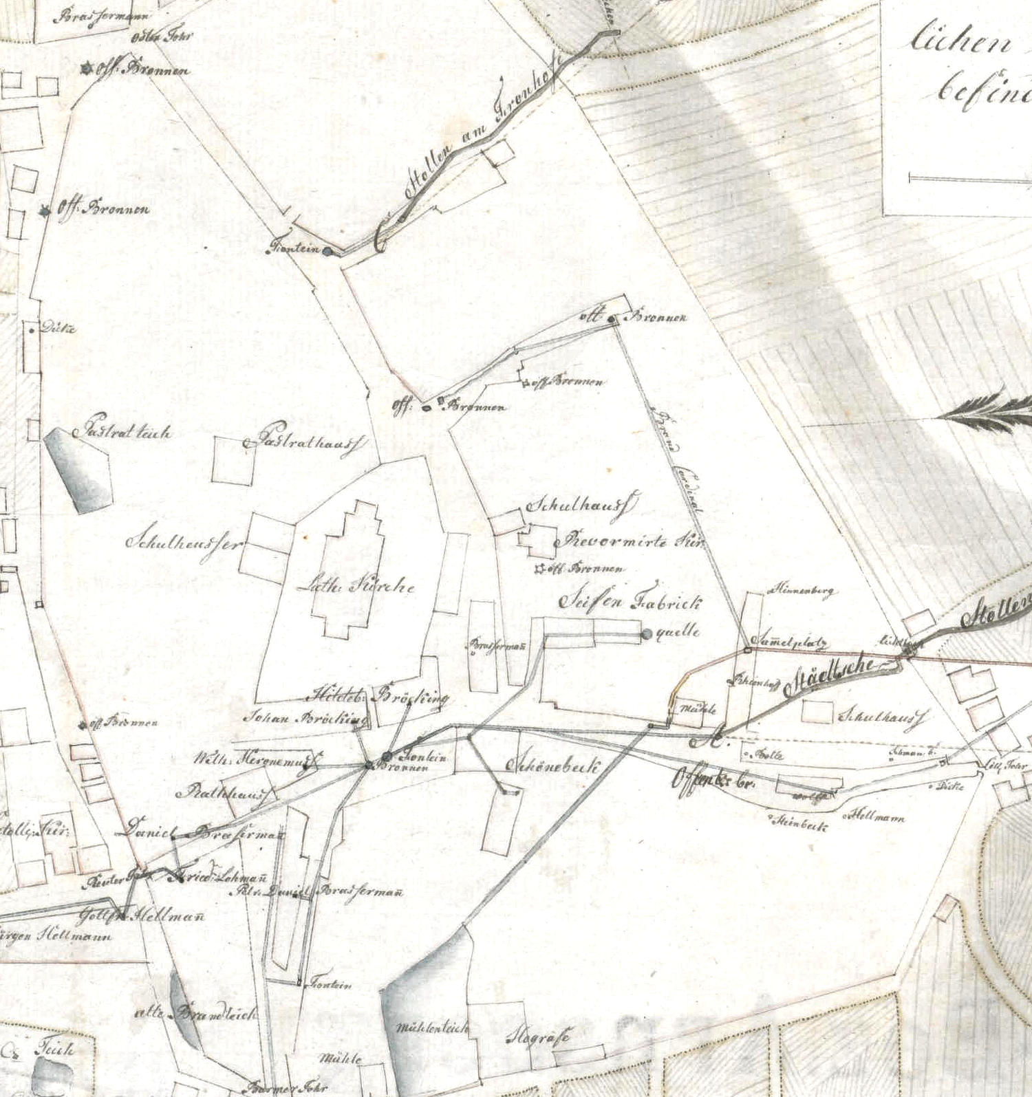 Bevor in Schwelm um 1905 Trinkwasser aus der Leitung kam, mussten die Menschen ihr Wasser an öffentlichen Brunnen holen. Einige Häuser hatten damals das Glück, eine Quelle direkt im Keller zu haben (heute ist man nicht mehr so glücklich). Wer es sich leisten konnte, ließ sich das Wasser von Wasserträgern bringen. In der Stadtkarte von 1722 sind die damaligen neun Brunnenstandorte eingezeichnet.