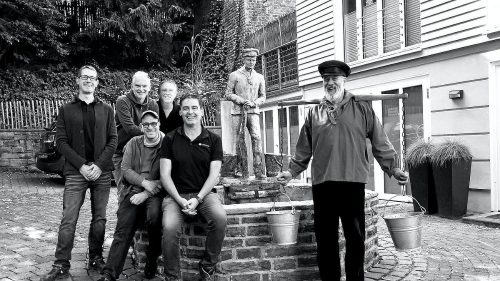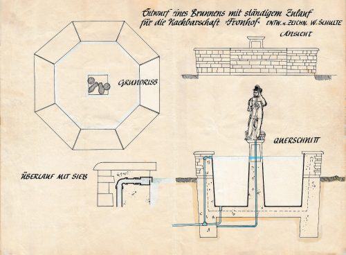 Der Brunnen mit der Figur des Wasserträgers wurde 1958 von der Nachbarschft Frohnhof auf Initiative von Obernachbar Heinz Maijer gebaut (s.a Kirchstr. 14). Die erste Ausführung der Figur des Wasserträgers fertigte Paul Schulte. Die zweite Ausführung, die noch heute steht, war das Werk seines Sohnes Hans Friedel Schulte. Der Entwurf stammte vom zweiten Sohn Wolfgang Schulte.